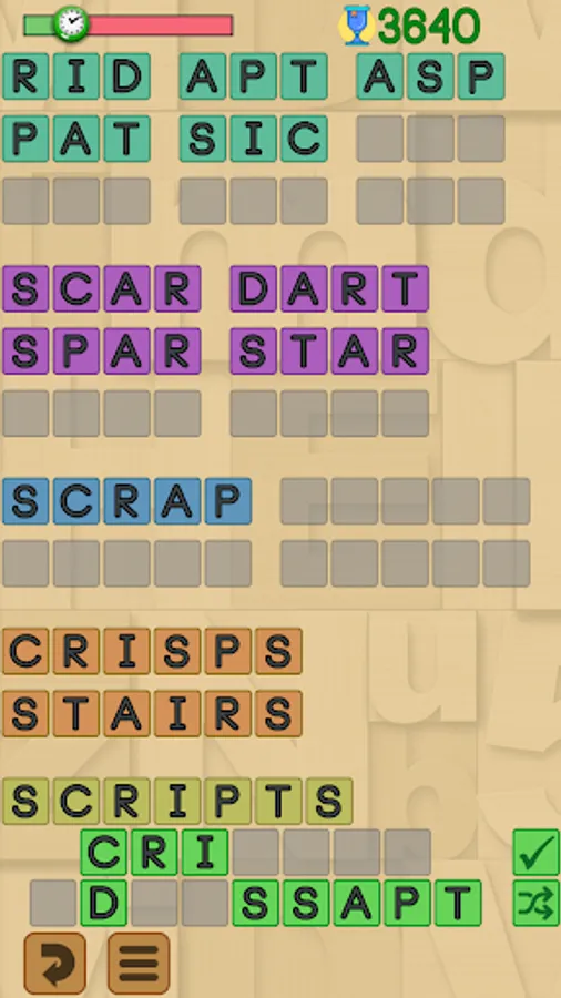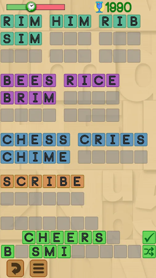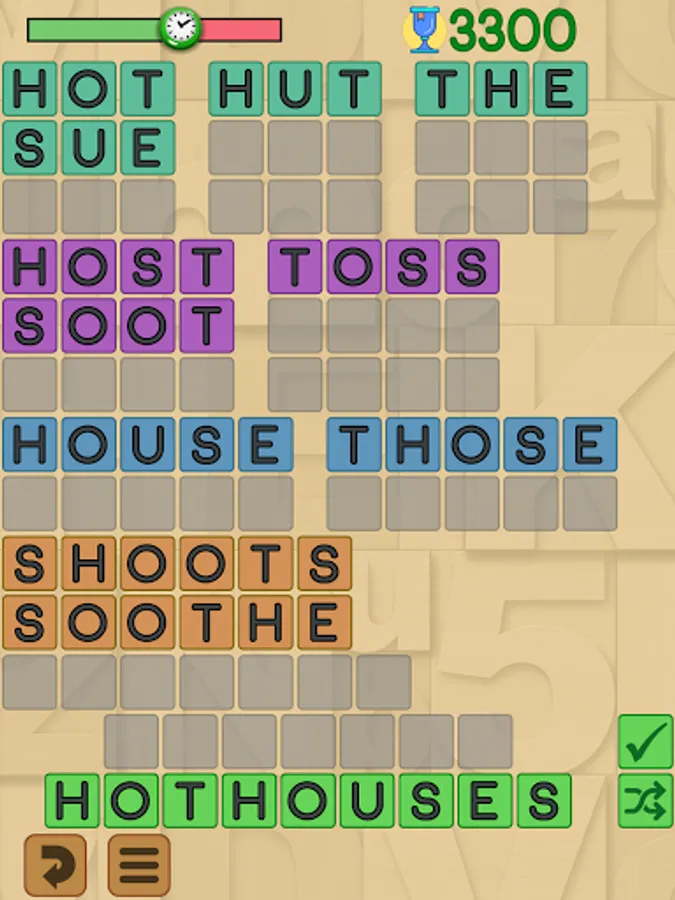 At the start of a new game a word is chosen at random from the massive 230,000+ word English language dictionary. A list of three, four, five, six and seven letter blanks is displayed for you to complete. Your challenge is to complete the list of blanks using only letters from the master word. If you have difficulty spotting new words you can mix the letters in the master word.
