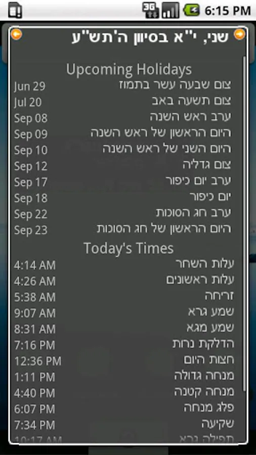 Hebrew Calendar with Parashat Hashavua, Jewish Holidays, Hannuka candles, Candle lighting times, Daf Yomi, Rosh Hodesh, Sfirat Omer and Prayer times (Zmanim).