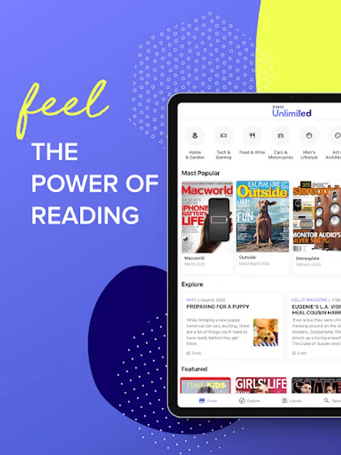 Entering the world of unlimited content means discovering publications in more than 15 languages and being able to access a variety of titles covering every interest you can imagine. Sports, fashion, food, culture, cars, technology, and many more will make you feel the importance of THE POWER OF READING.