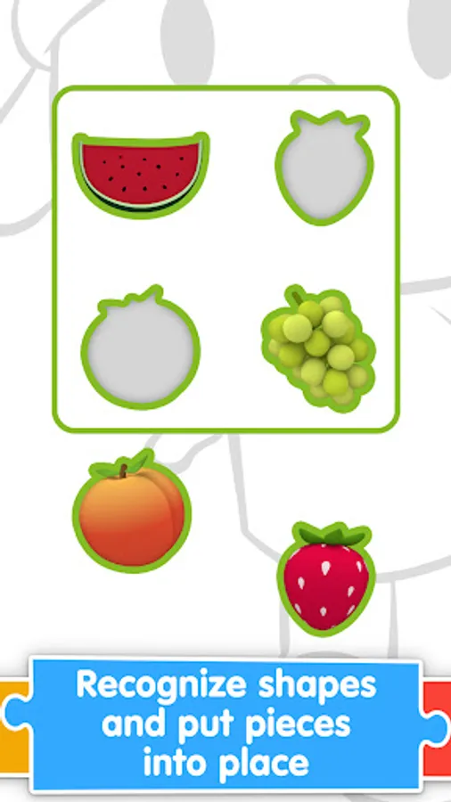 - In the Puzzles App's Fit the Pieces Together mode, the image is broken down into several parts; recognizing the shapes, children have to drag each part of the drawing to its proper position and superimpose it there.