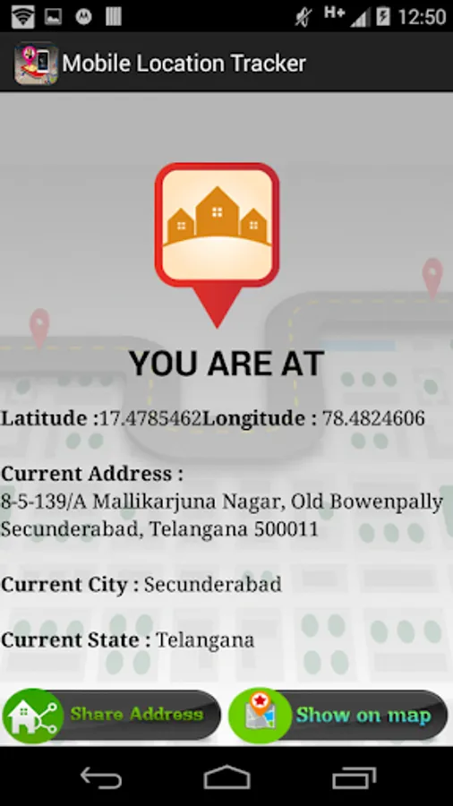 2 : Address finder : It will fetch Address of phone current location. You can share with anyone or family to let them know. A complete GPS MAP graphical interface implement to view address on it.