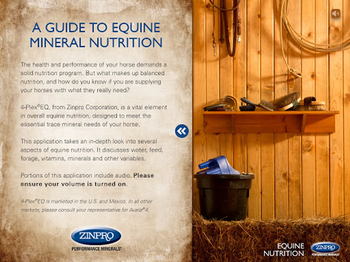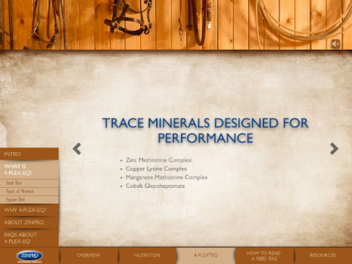 Introducing your FREE guide to all things Equine Nutrition. Zinpro Corporation pioneered much of the research on trace minerals and their role in equine nutrition. That nutritional information, along with other key nutritional considerations are now available to help bring out the best in your horse in one convenient, free app. From the necessary amount of water to how to identify trace minerals on a feed tag, the answers to better equine nutrition are right at your fingertips.