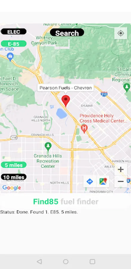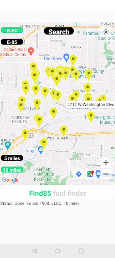 5 and 10 miles search radius. Move the map to search an area. Switch between E85 or Electric. Click the map icons to open the location in the map app to get directions and additional details.