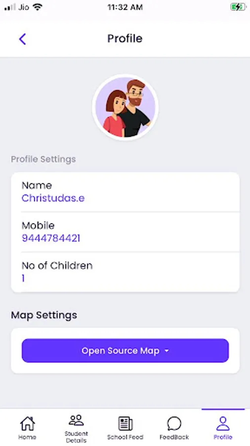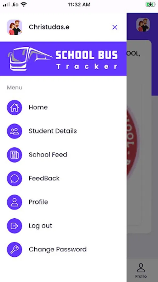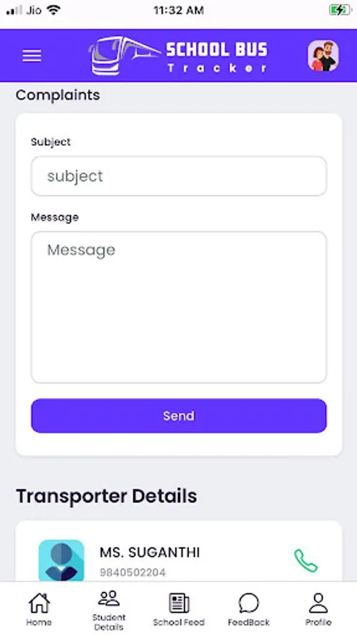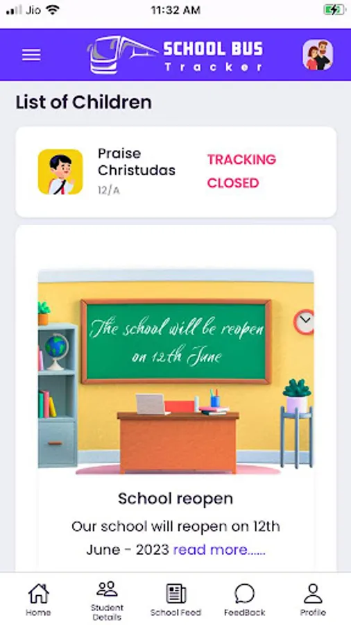 It includes services like Live Tracking, Student Details Management, Feedback Collection, School Feeds,