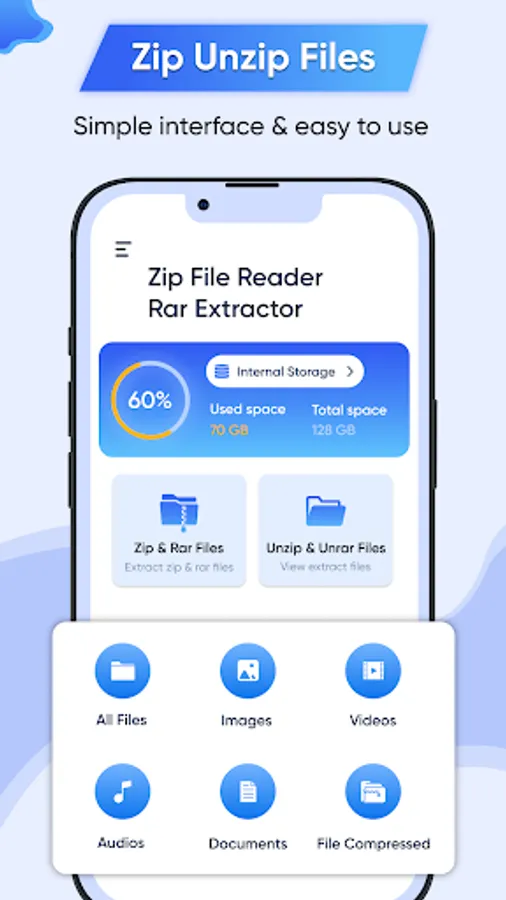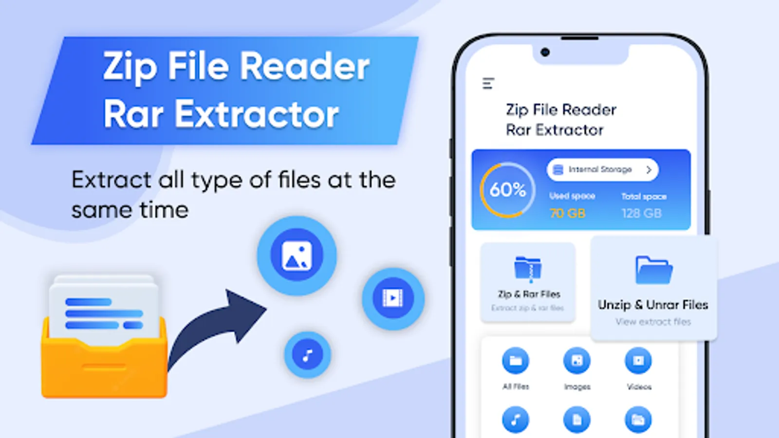 Furthermore, the zip app allows the user to unzip files stored on the device. If the user wants to work with the zip files, they are required to unzip them first. Hence, this tool is equally important and beneficial for the user. The zip file reader free download has six features including; all files, images, videos, audios, documents, and my compressed files. In addition, the zip file reader app shows the internal storage of the device. Through this feature, the user can determine the free space and total space of the device. Finally, the user can also share the application with his friends and family with just a click.