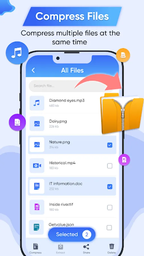 If the user wants to compress any particular file, they are required to click on the all files tab on the home screen of the zip extractor. After selecting the file, they simply need to click on the compress button at the bottom. They can also rename the file before saving it.