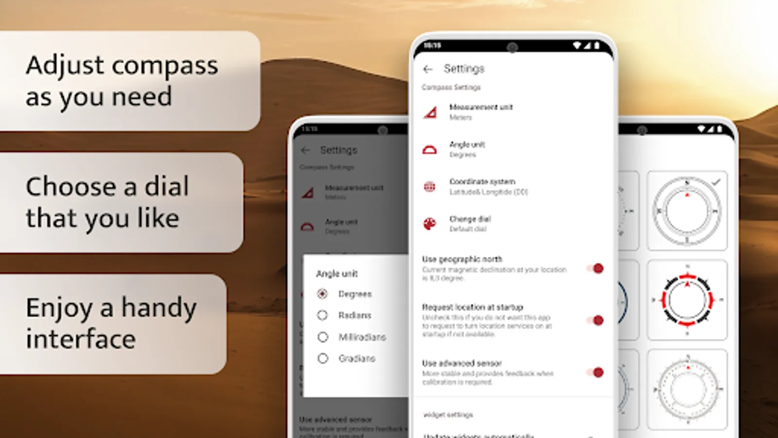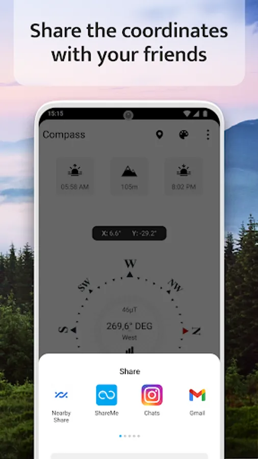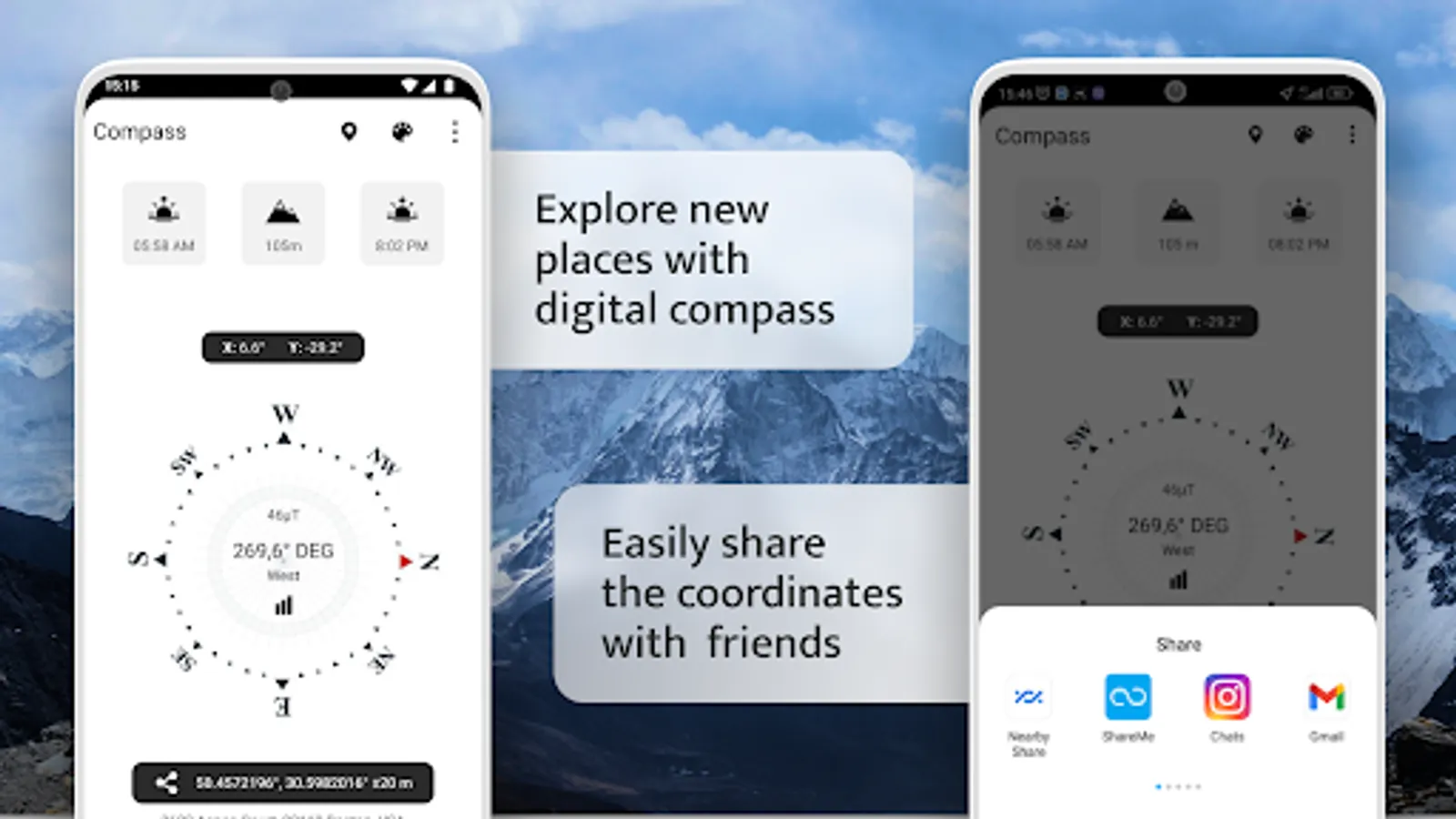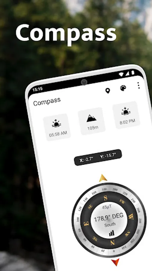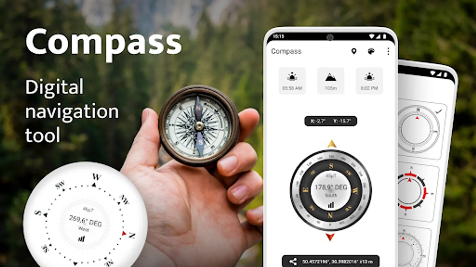 Discover Precise and Simple Compass with Altimeter, Sunrise, and Sunset! Retrieve helpful information about your current position! True altitude above sea level at your current position.