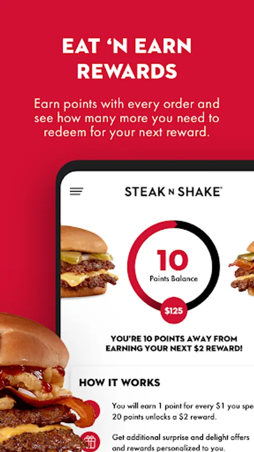 Conveniently order ahead for your favorite hand-crafted Steakburgers, Homemade Milkshakes and more. Build your perfect burgers and shakes with the toppings you want. Choose takeout, delivery, curbside pickup or our new car hop option. Use our car hop service by choosing a spot to park in when you arrive. Then, from the comfort of your car, let us know your spot number. We'll bring your order right to your car. Our new Curbside experience lets us know when you arrive so that we can bring your order out to you—hot and fresh. Every order earns points that you can redeem for delicious rewards. Get surprise bonus offers and rewards personalized to your tastes.