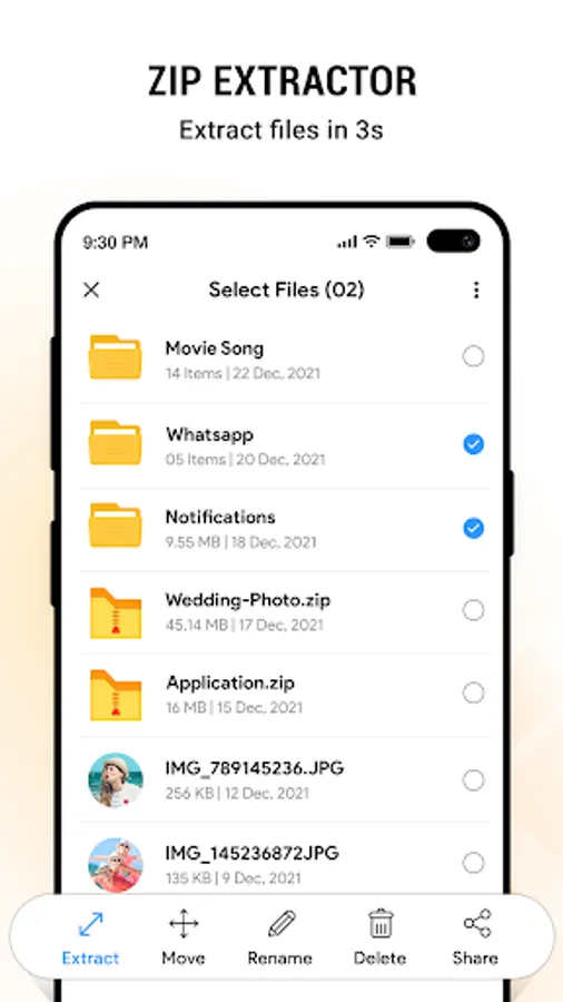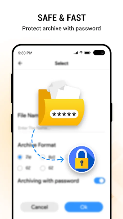 • Easy access to a variety of file types including doc, png, pdf, mp3, mp4, apk, excel, txt, etc helping users to compress a variety of documents, images, videos, audios into the same a convenient file for sending