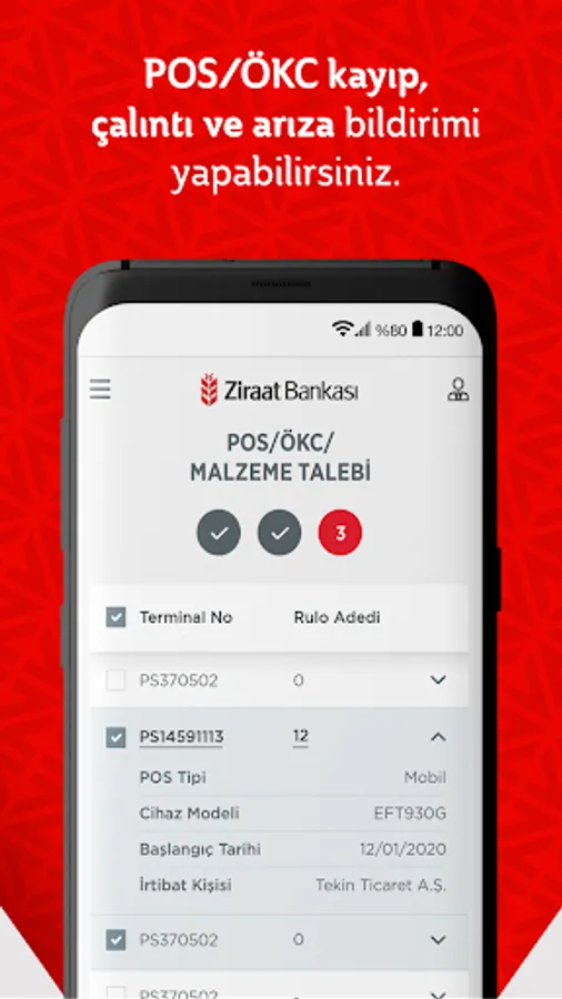 You can make a pre-application for POS / ÖKC / Virtual POS without going to the branch, and also send your roll and sticker requests for our Bank's POS. You can report POS / ÖKC loss, stolen and malfunction.