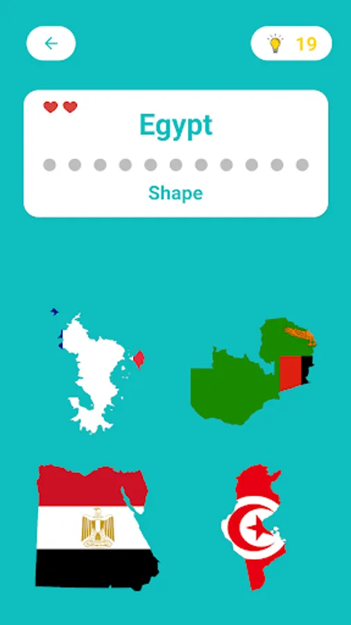 Capital, Continent, Shape, Population, Flag, Flag's Colors, ISO code, Landlocked or Coastal, Religion, Languages and Neighboring Countries are all the mini quizzes placed in 3 difficulty levels.