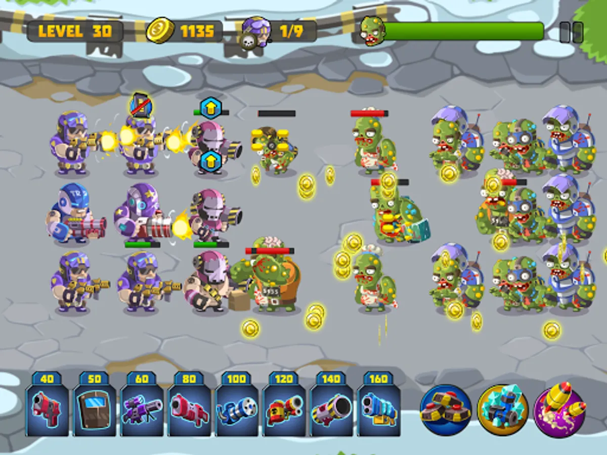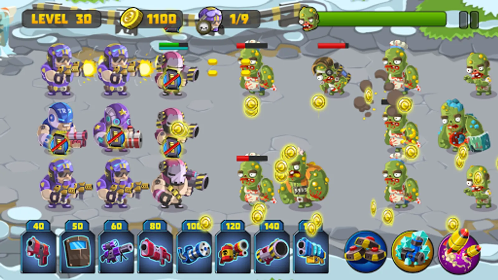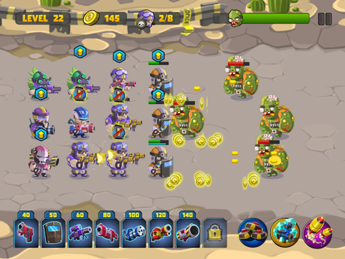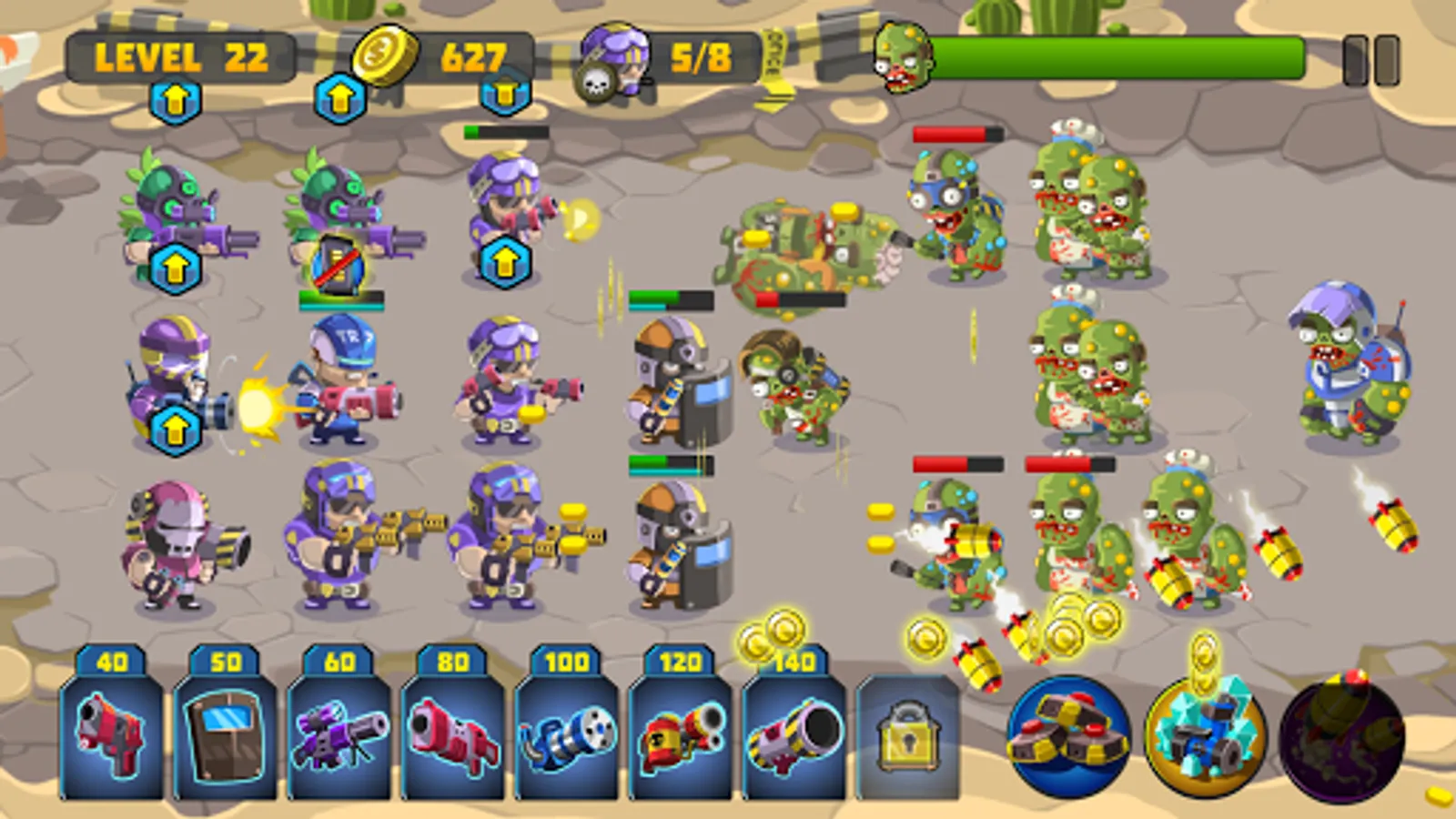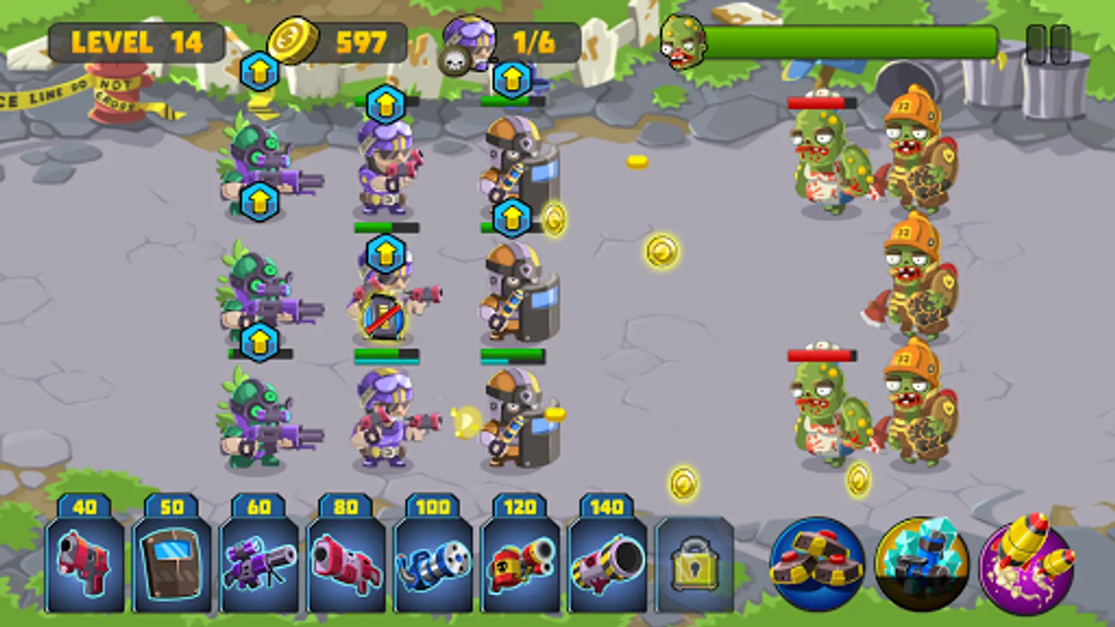 Zombies are trying to invade! The Army has a chance to defeat them though. Each character is unique and has its own weapon and skill. The Army must defeat the zombies before they reach the city though.Upgrading your team is essential! Without a strong team the zombies will invade! Now it's up to you to kill all the zombies by getting skills, coins and diamonds!