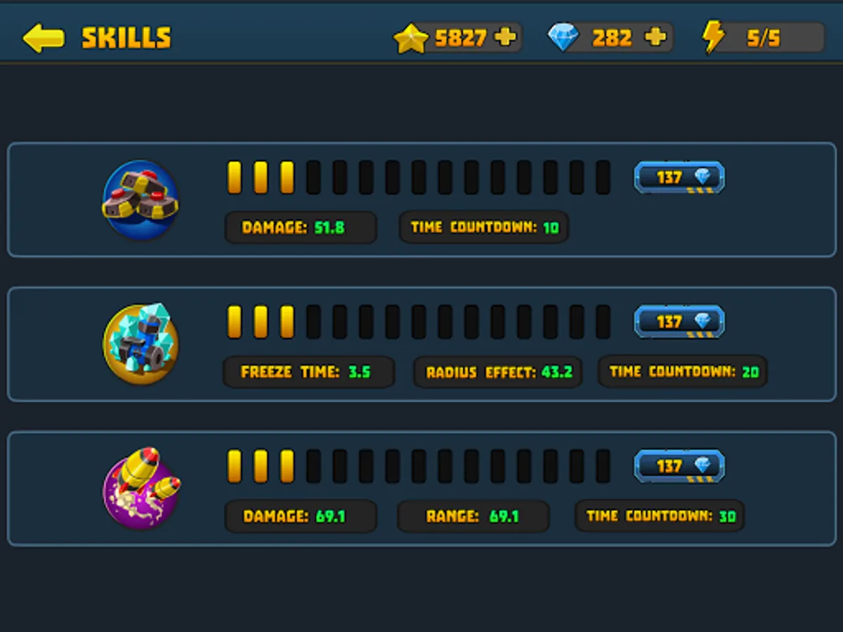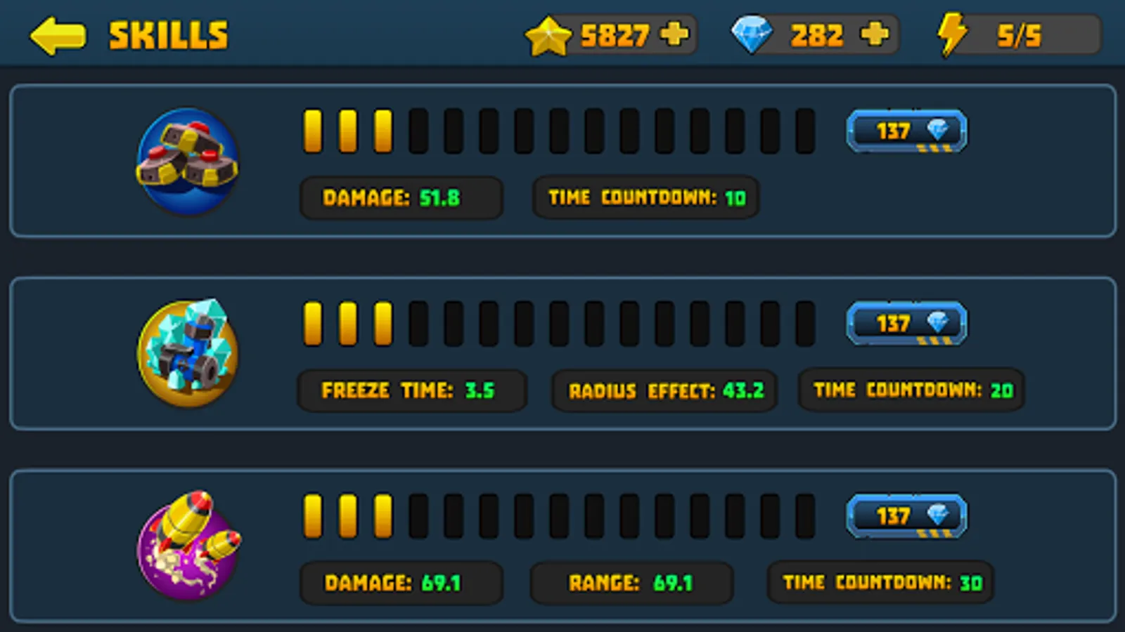 - 3 skills: Mine, Freeze Ray, and Rocket