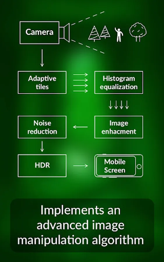 Disclaimer: this is not a night vision app. Night vision equipment uses optoelectronic image enhancement technology. This technology uses a series of optical lenses and a special electronic vacuum tube to capture and amplify the visible and infrared light that is reflected off nearby objects. Mobile phones does not have such specialized hardware therefore apps claiming to have night vision functionality are scum.