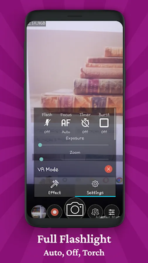 A ton of customization options! You can adjust shutter sound, bright screen, volume key functions, record with audio, burst shooting, grid lines, crop guide, video and image resolution, capture size, various display information and many more.