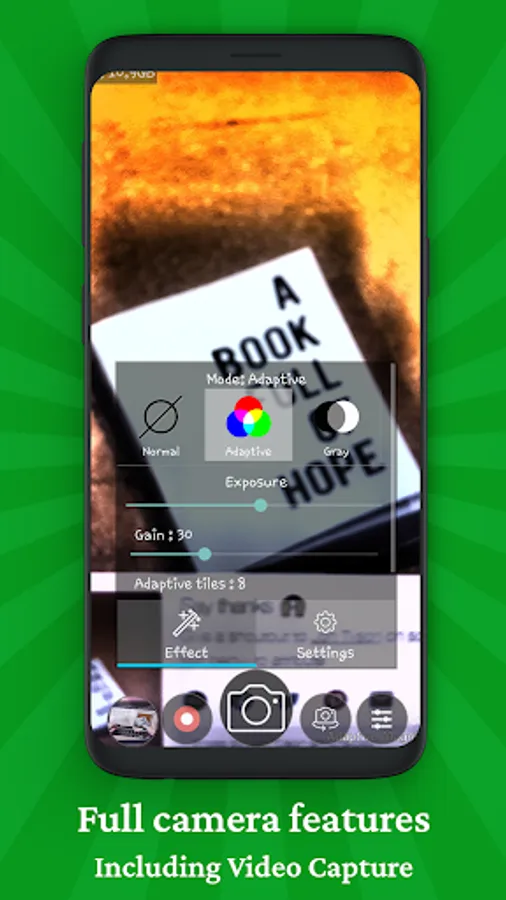 Adaptive magnifier allows you to save photos from camera, record videos and apply effects on photos from gallery.