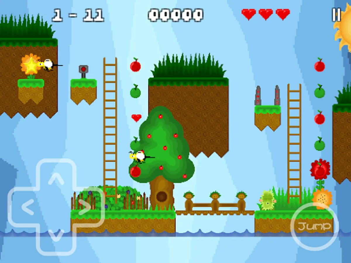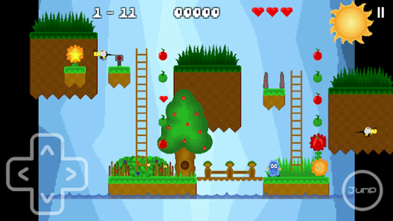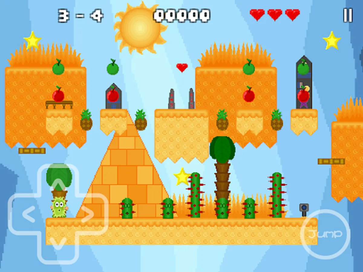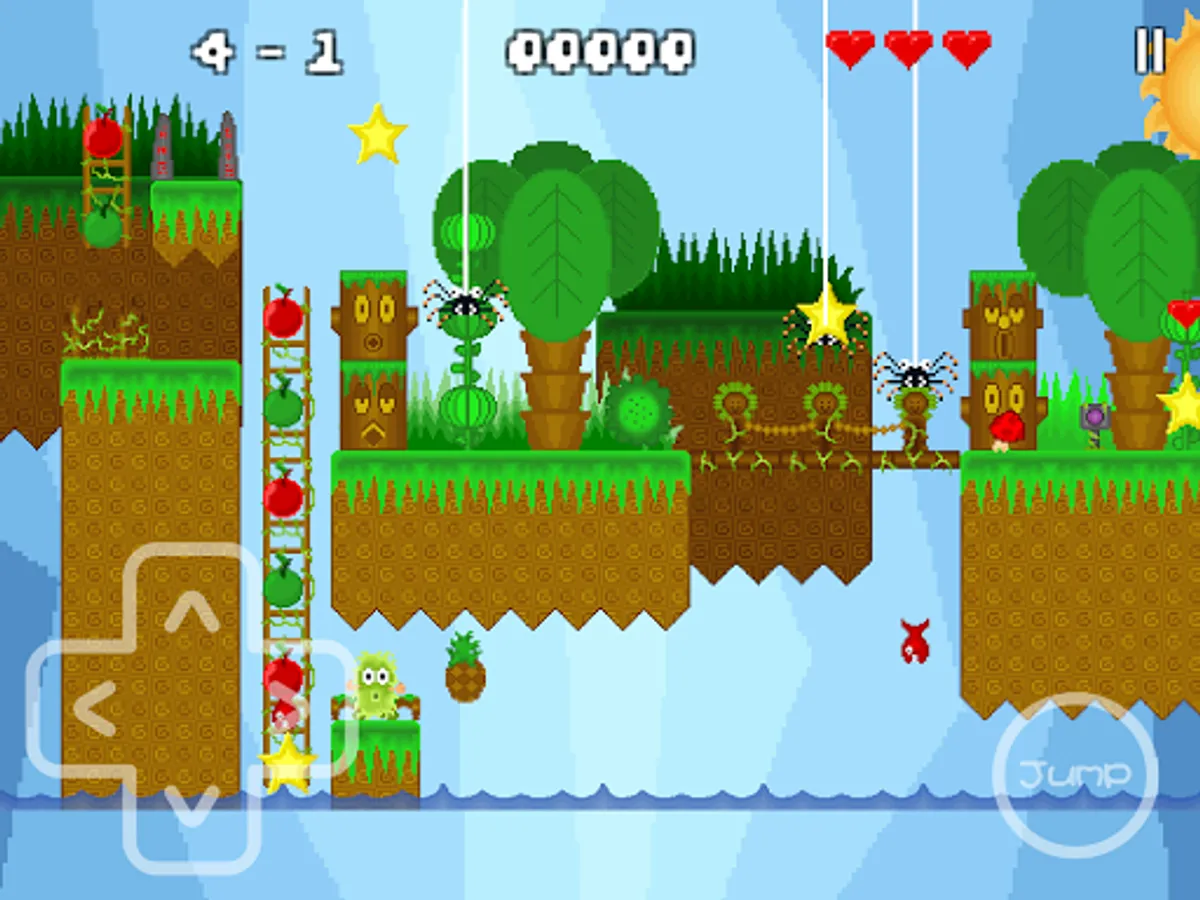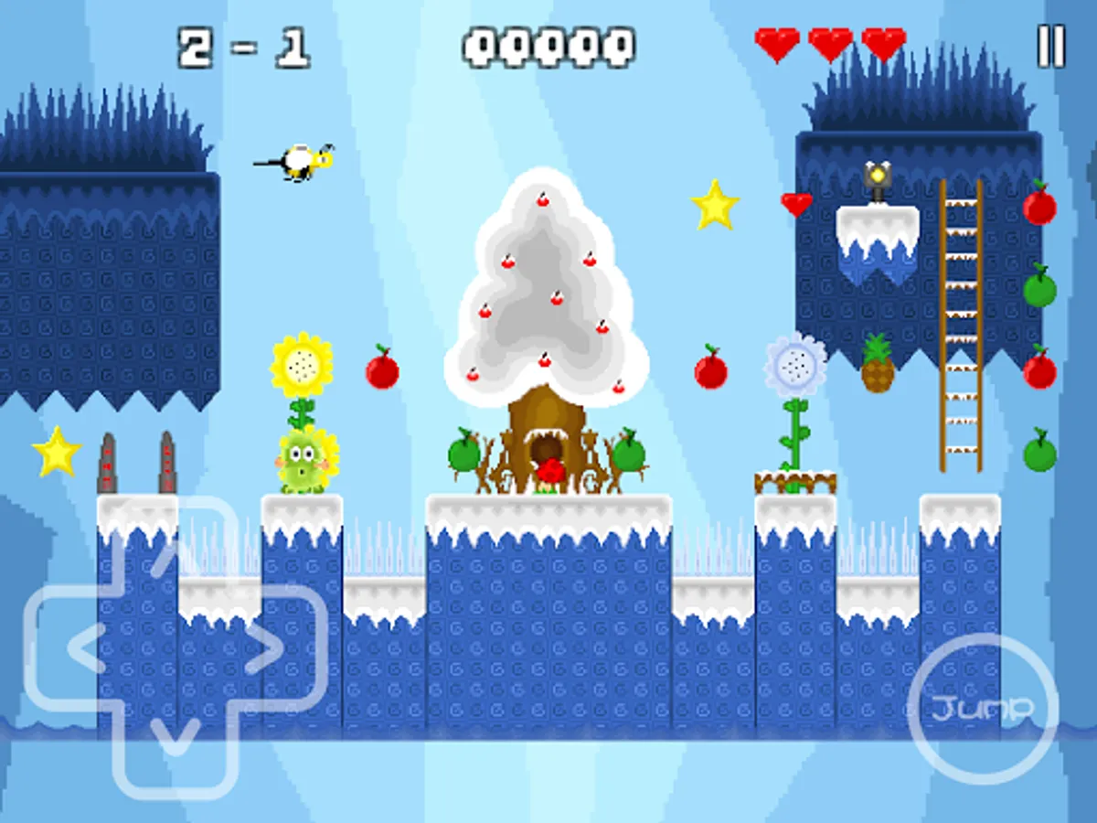 This game contains 48 well designed levels in 4 different themes: forest, frost land, desert, and jungle. There are also various enemies and obstacles, simple game play, and retro graphics and music/sound effects.