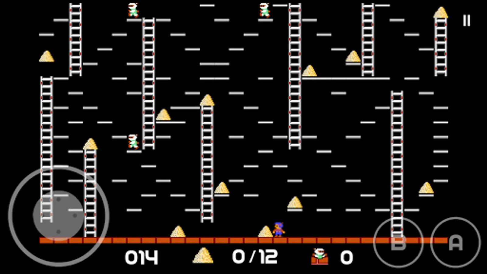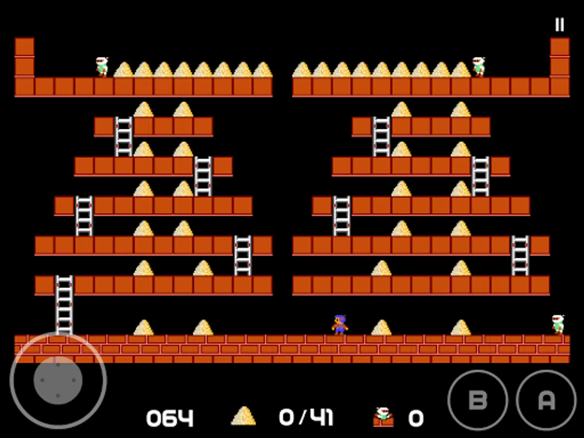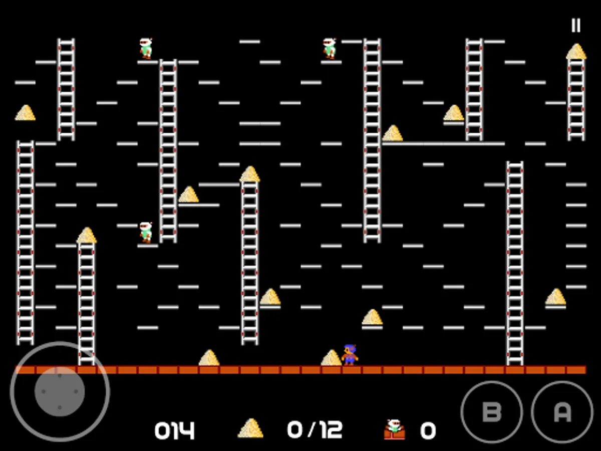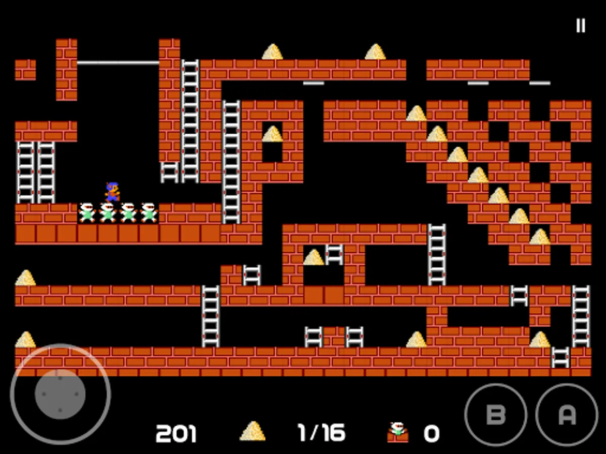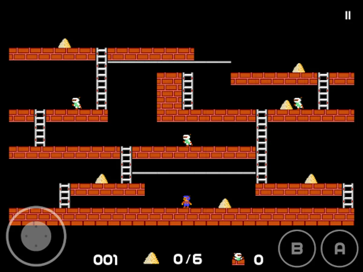 If a guard falls into a pit and gets stuck, it will become safe (for a moment) for you to run over him. He will release any gold he is carrying. Any holes that you've drilled will fill in again after a period of time, and guards caught in them when they refill will die and be replenished by new guards at the top of the screen. Guards can climb out to pits that do not close up around them. Your player cannot climb out of pits and will die if trapped in a pit that is only a single brick wide. Your player may also get caught in a situation with no way out and yet be alive. In this case you can only click pause—> reload to restart the level.