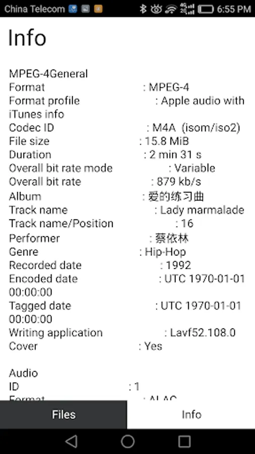 Audio: format, codec id, sample rate, channels, bit depth, language, bit rate…