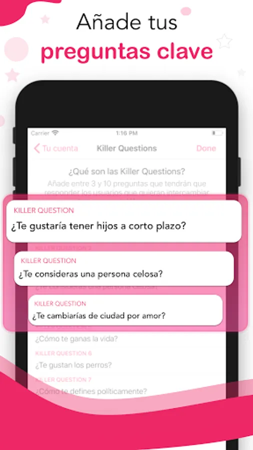 Each user adds several key questions to their profile, Killer Questions, that singles interested in connecting must answer so that their answers are valued when accepting or rejecting the application.