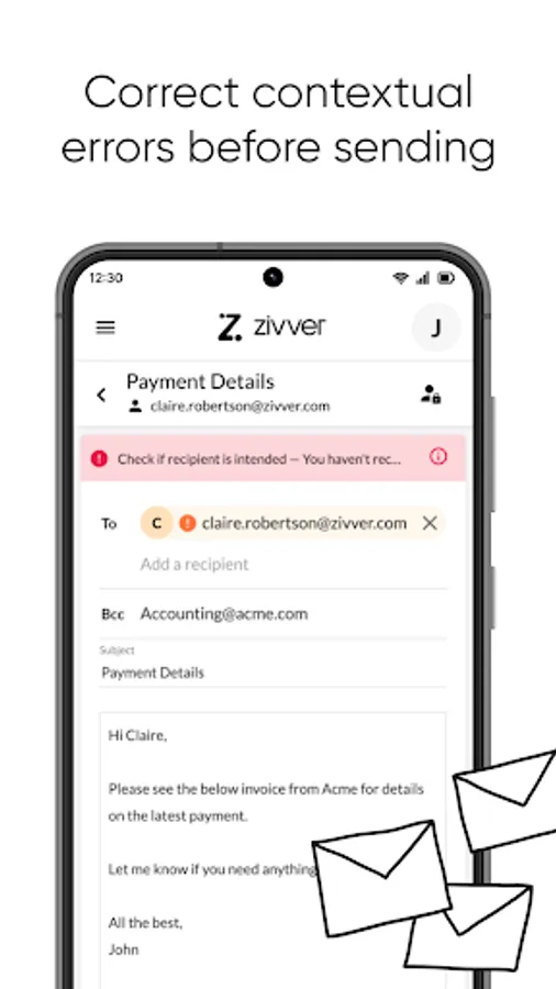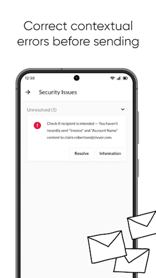 On top of using advanced end-to-end zero-knowledge encryption, Zivver identifies potential anomalies in real-time when you’re sending communications from our Web application, Outlook plug-in and mobile app. The non-intrusive prompts enable you to catch mistakes before hitting send without disrupting any workflows.