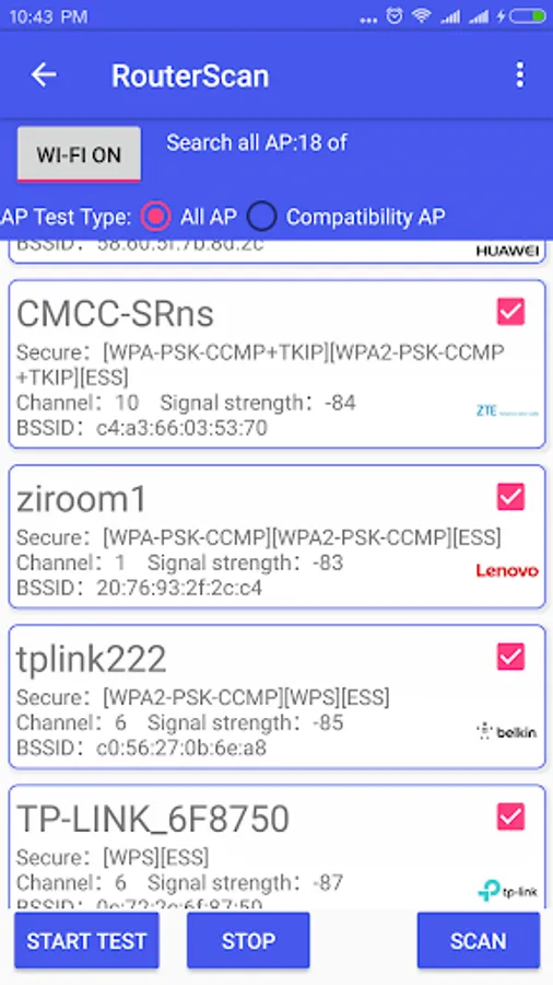 1. You can connect the Wi-Fi connection test with the specified SSID at the same time and verify the file download. At the same time really WEP, WPA, WPA2 IEEE802.1x and other security types to connect the test. You can view the signal strength, MAC address of each wireless router in the test.