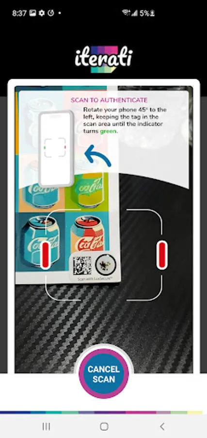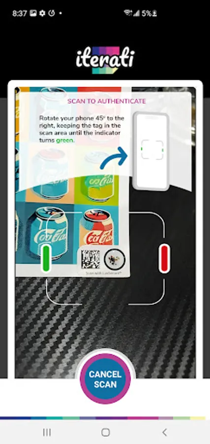A quick and easy camera based scan sequence can validate the authenticity of an Iterati tamper-proof label as well as retrieve information about the associated artwork that has been enrolled using the Iterati physical authenticity platform.