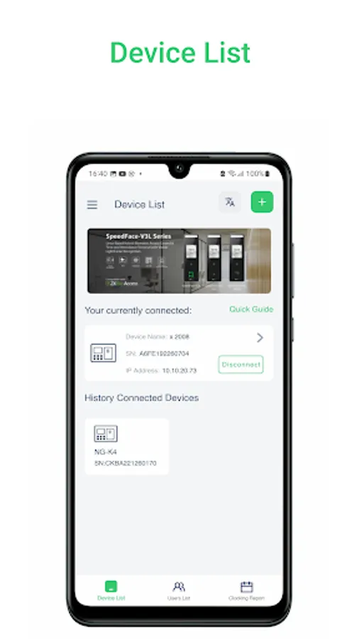 Zlink Assistant is a mobile application gadget designed to provide customers with a more convenient way to operate their devices remotely. customers can quickly connect to the app by scanning the connection QR code on the device or manually entering the device IP, port and password. It supports completing basic user management on time and attendance devices from mobile, viewing daily attendance data, and presenting users with the most needed information in the app.