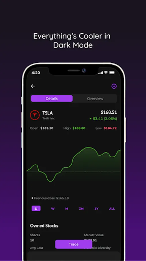 • For every stock in the app, there is a detailed description of what that specific company does, along with some of its key financial statistics.