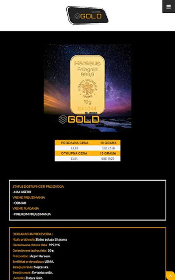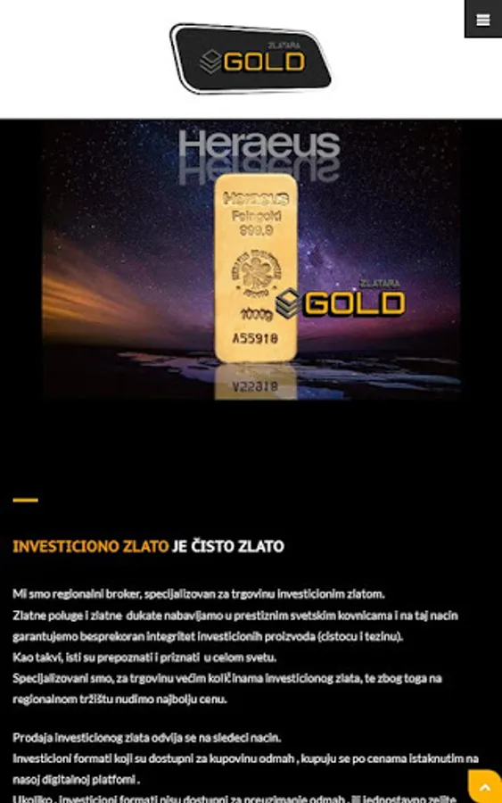 We are a regional broker, specializing in trading gold investment. We specialize in trading larger quantities of investment gold, and that is why we offer the best price on the regional market. On the recommendation of the LBMA (London Bullion Market Association) member of the London Gold Exchange and the WGC (World Gold Council) for the development of the world gold market, we have made available on the market investment formats of prestigious mints HERAEUS and VALCAMBI. According to European legislation, investment gold is produced in the form of gold plates, whose minimum accepted weight is 1 g and whose guaranteed purity is equal to 995/1000, or higher. We offer you internationally recognized investment units (gold bars) in physical form… Each gold plate has the manufacturer's name and serial number imprinted on it, which makes it unique and unrepeatable all over the world. According to the way of doing business, we perform our brokerage activity as an open financial institution. With us, you can always buy investment units, for which you are committed, and we can buy them from you at your request.