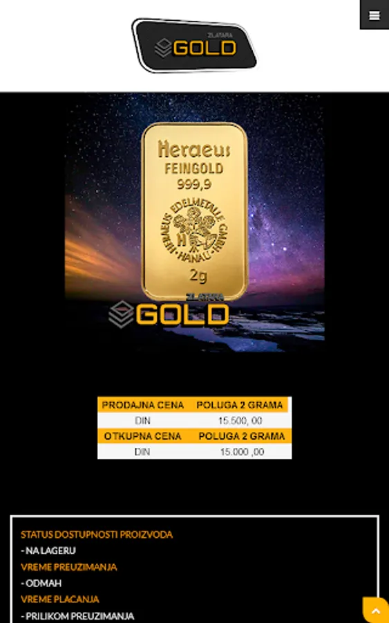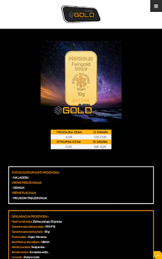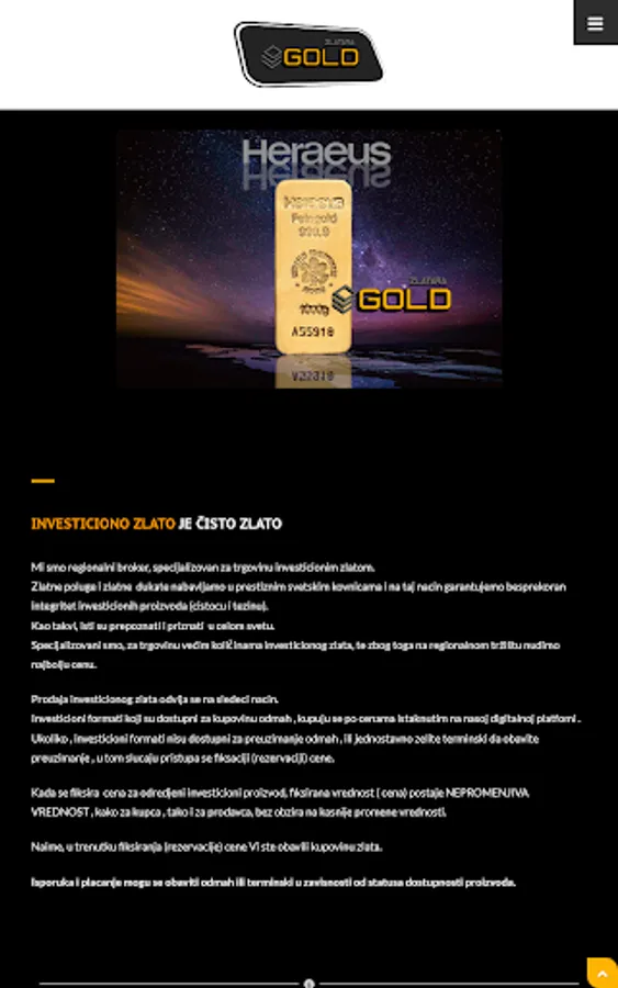 We are a regional broker, specializing in trading gold investment. We specialize in trading larger quantities of investment gold, and that is why we offer the best price on the regional market. On the recommendation of the LBMA (London Bullion Market Association) member of the London Gold Exchange and the WGC (World Gold Council) for the development of the world gold market, we have made available on the market investment formats of prestigious mints HERAEUS and VALCAMBI. According to European legislation, investment gold is produced in the form of gold plates, whose minimum accepted weight is 1 g and whose guaranteed purity is equal to 995/1000, or higher. We offer you internationally recognized investment units (gold bars) in physical form… Each gold plate has the manufacturer's name and serial number imprinted on it, which makes it unique and unrepeatable all over the world. According to the way of doing business, we perform our brokerage activity as an open financial institution. With us, you can always buy investment units, for which you are committed, and we can buy them from you at your request.