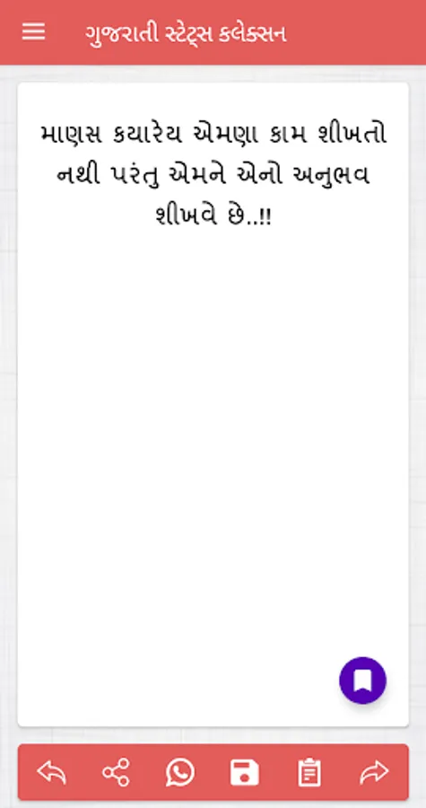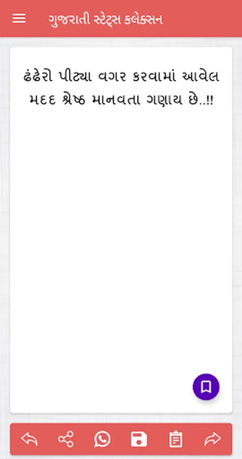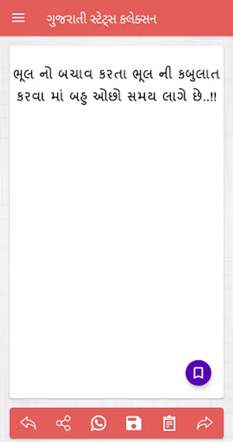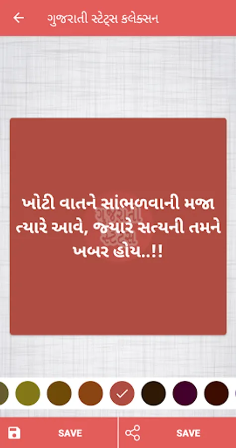 The Gujarati Status 2023 app aims to inspire, motivate, and bring positivity to your life. Share these statuses with your friends, family, and social media followers. Whether it's through SMS, messaging apps, or social networking sites, you can effortlessly spread inspiration and motivation. The app also enables you to create captivating status images with different background colour options, enhancing the visual appeal of your messages. Empower your friends and loved ones with these powerful Gujarati statuses, enriching their lives with positivity and motivation.