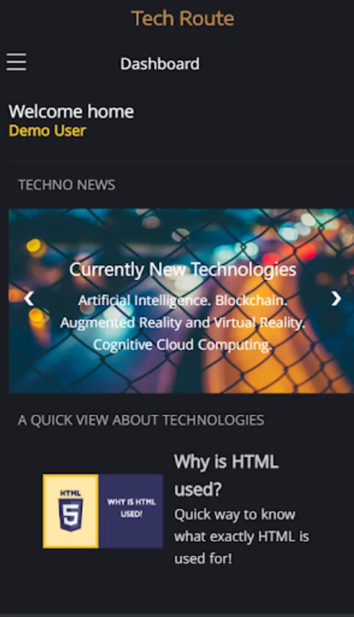 Tech Route is a user friendly application. Now learn technologies online with tech route. WITH NO AGE RESTRICTION. Tech Route is a way for you to explore the route towards technology. It lets you choose the course you wanna learn. Now have fun with tech route.