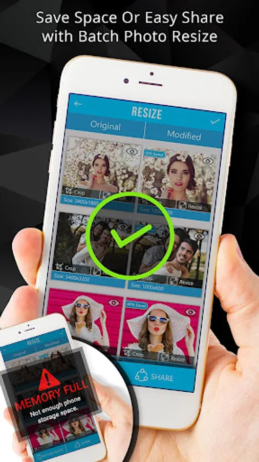 Photo Resizer comes with Batch feature where you can resize multiple images at once and can share all resized pictures as zip directly from the app.