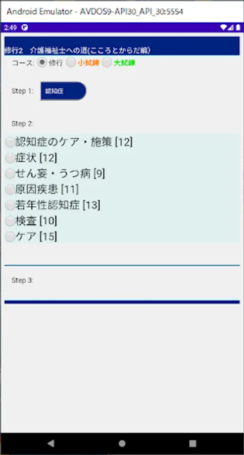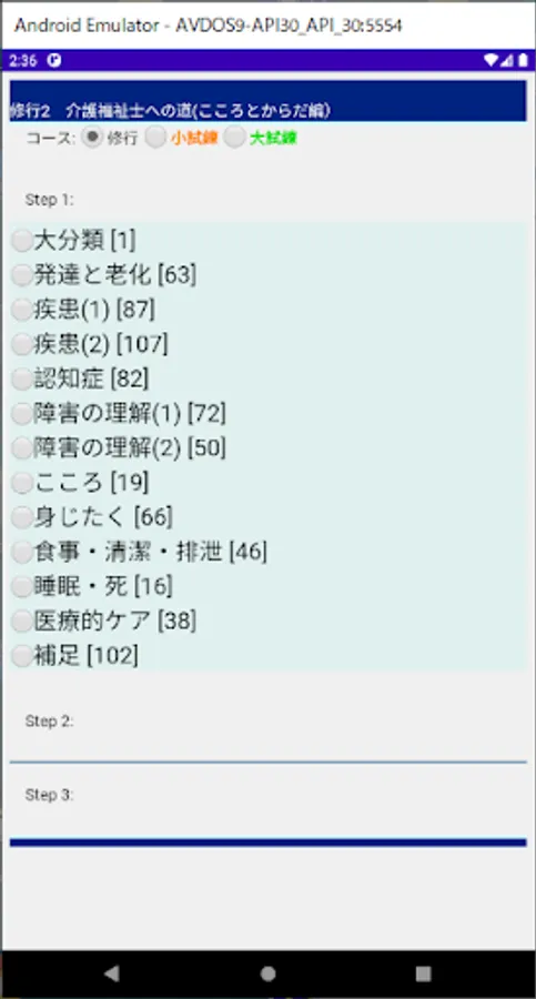 Items in each field are development and aging (growth and development, infant-adult, characteristics / personality of old age, memory of old age, diseases of old age, causes of death of elderly people), diseases (brain / nervous system, Visual, auditory, oral / dental, respiratory, endocrine / metabolism, diabetes, urinary tract, urinary tract, bone / motor organ, joint, digestive organ, circulatory organ, skin, infection, congenital disease, malignant tumor), dementia (Care / measures for dementia, symptoms, dementia / depression, causative diseases, juvenile dementia, examination, care), understanding of disabilities (persons with disabilities, concept of disability, welfare for persons with disabilities, visual impairment, hearing impairment, limbs Inconvenience, internal disability, mental disability, higher dysfunction, intellectual disability, developmental disability, intractable illness, psychological / support), mind (desire / self-concept, mind / social behavior, body, bone / muscle, joint, joint・ Muscle, movement / posture, sickness), diet / cleanliness / excretion (nutrients, dietary mechanism, cleanliness maintenance, urination, defecation), sleep / death (about sleep / death), medical care (medical care, vital sign) , Sputum aspiration, tube feeding), supplements (sugar, lipid / protein, inorganic, vitamins, brain / nervous system, muscle / neurological disease, respiratory system, circulatory system, digestive system, chemical symbol).