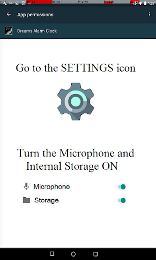 This app requires the use of your device’s microphone and internal memory. These devices should be set opened upon the initial download. If the app fails to record or states “Unfortunately, Dreams Alarm Clock has stopped” go to: “Settings (the Gear) Apps Dreams Alarm Clock Permissions”, and set the Microphone and Internal Storage to ON. If you are no longer using this app you may want to set the microphone to OFF.