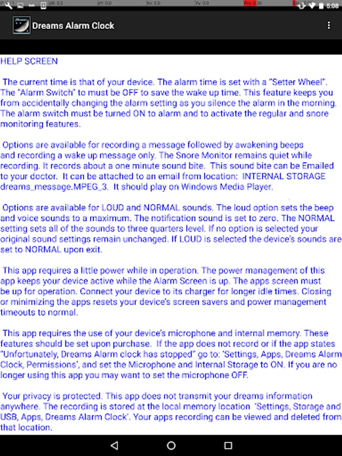 Your privacy is protected. This app does not transmit your dreams information anywhere. The recording is stored at the local memory location “Settings Storage and USB Apps Dreams Alarm Clock”. Your apps recording can be viewed and deleted from that location.