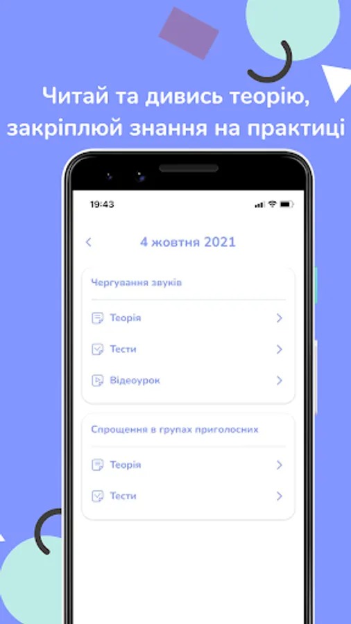 To learn effectively, you need to practice three times a week in the application: on Mondays, Wednesdays and Fridays you have to watch the lesson (theory, video lesson, tests).