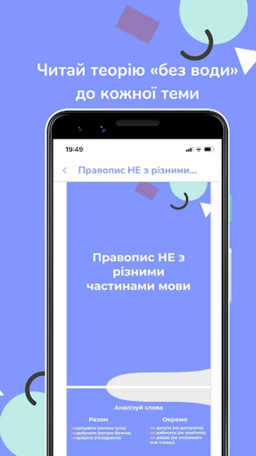 In the theoretical part of the application will help you with special notes, where there is only the necessary information to pass the exam for a high score. If there are any unclear points - watch the video tutorial with an analysis of the rules in practice.