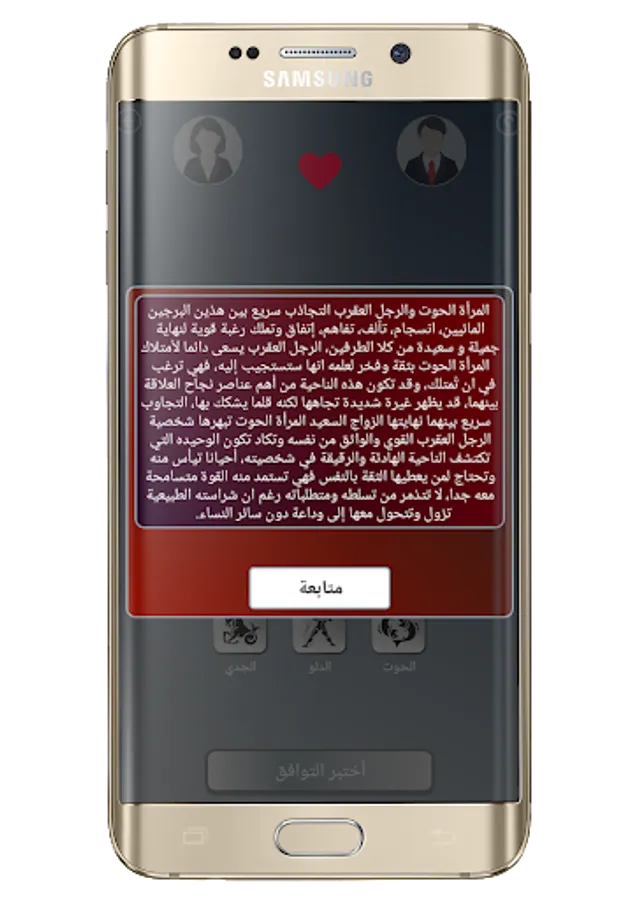 - اختبار التوافق بين الابراج حيث يتم عرض تفاصيل دقيقة عن العلاقة بين اي برجين