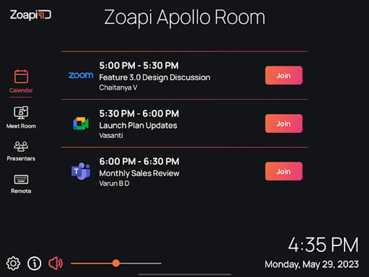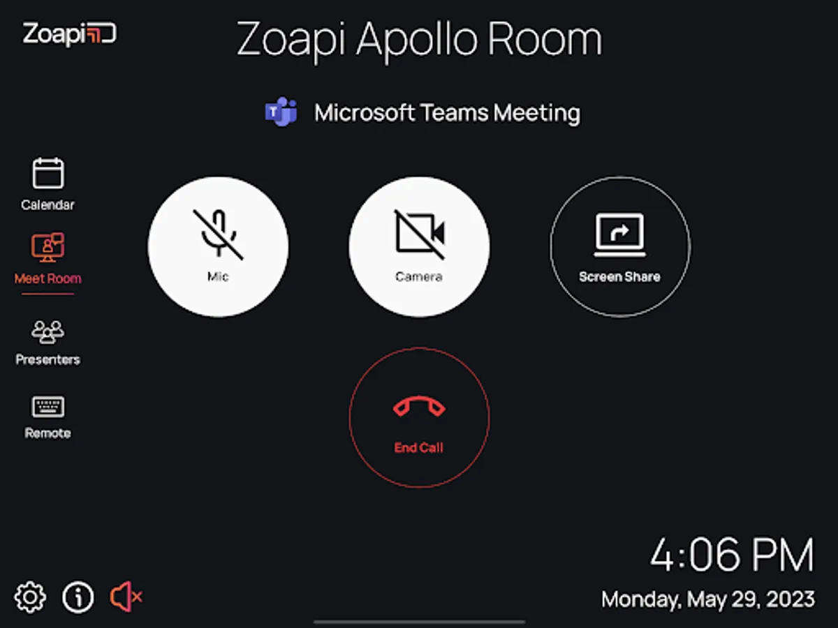 The Zoapi Room Controller brings all your meeting room controls to your iPad.