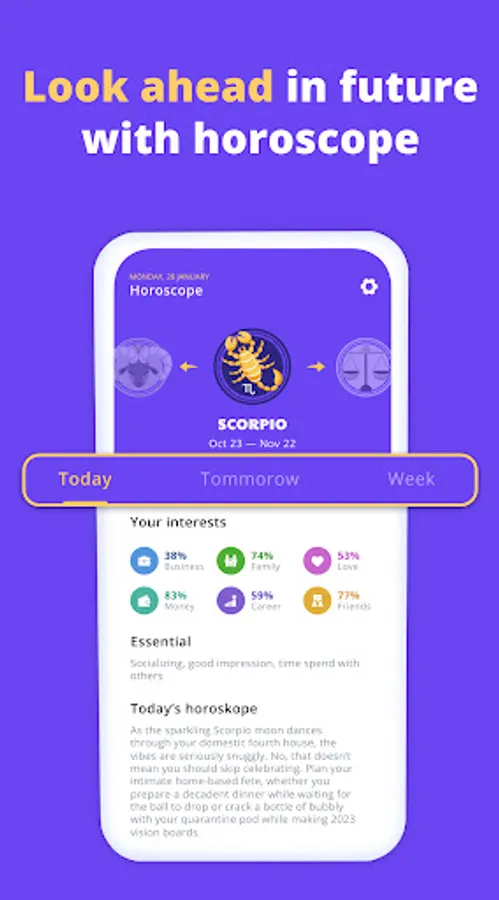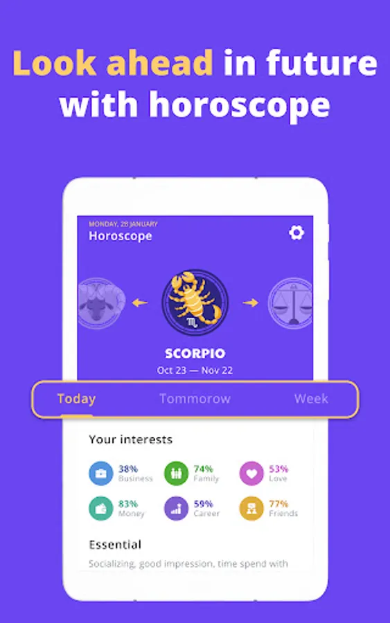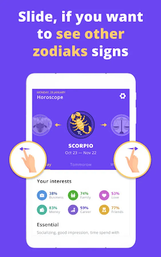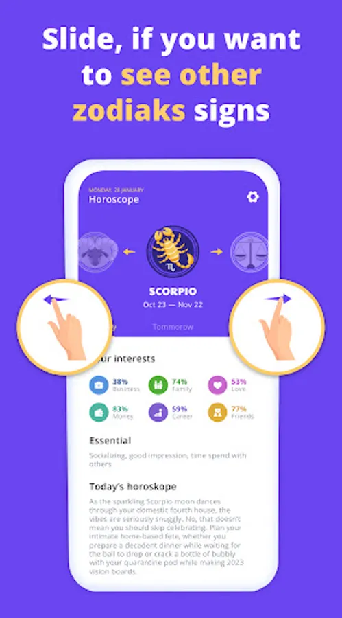 Horoscope tomorrow is an app that will make your life more interesting. Astrology is very popular today, but not all resources are reliable. We can understand this, so our app provides only classic, checked info. â¡You no longer need to worry about your future or be unsure about the present; Everything that piques your interest can be checked on this powerful zodiac program. Our astrology prediction app is perfect for those who want to stay connected to the cosmic energies and tap into their full potential. Whether you're looking for guidance in love, career, or personal growth, our app provides the insights and tools you need to navigate life's challenges and opportunities. Another advantage of astrology apps is their flexibility. Users can choose to engage with the app as much or as little as they like, depending on their needs and interests. ðª