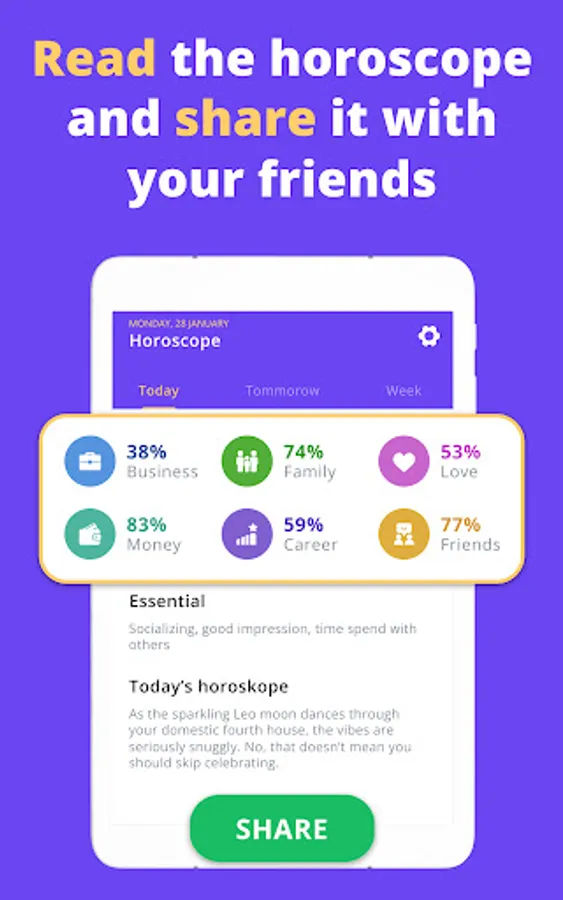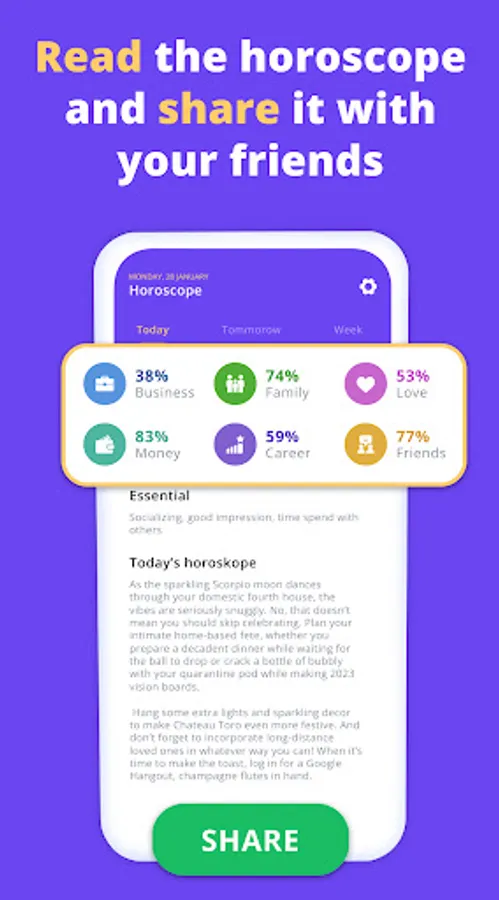 Whether you're curious about your love life, career prospects, or health and wellness, Horoscope Today has you covered with accurate and insightful predictions based on the latest astrological data. â¡You can check all questions which bother you every day. Personal horoscopes are available for everyone, all that you need - is only your smartphone and installed application. Share with friends and check their predictions too! Stay updated about important life issues together. One of the main advantages of astrology apps is their accessibility. With just a few taps on a smartphone or tablet, users can access a wealth of astrological information and insights from anywhere in the world. Many apps also offer community features, such as chat rooms and forums, where users can connect with like-minded individuals and share their experiences and insights.