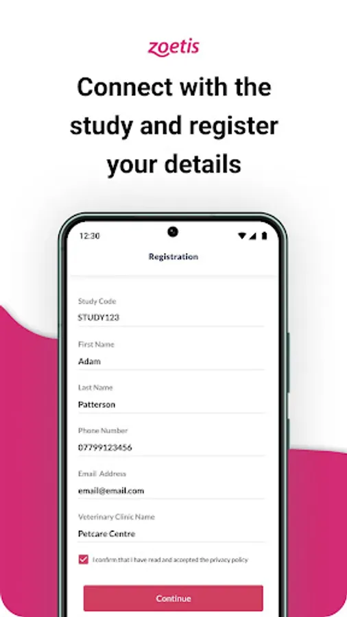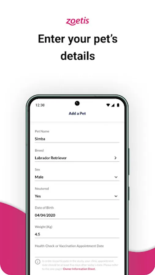 If your veterinary practice is participating in the research study, enter the unique study code they provide you with into the app and then register your details and those of your dog. You will be required to submit your answers to a simple yet insightful quality of life survey of your dog and to discuss the results with your veterinarian during your dog’s next routine health check & vaccination appointment. A notification on your phone will ask you to confirm the upcoming vet visit. You will also be notified when the quality of life survey is due and reminded the day after if you missed the due date to take it.