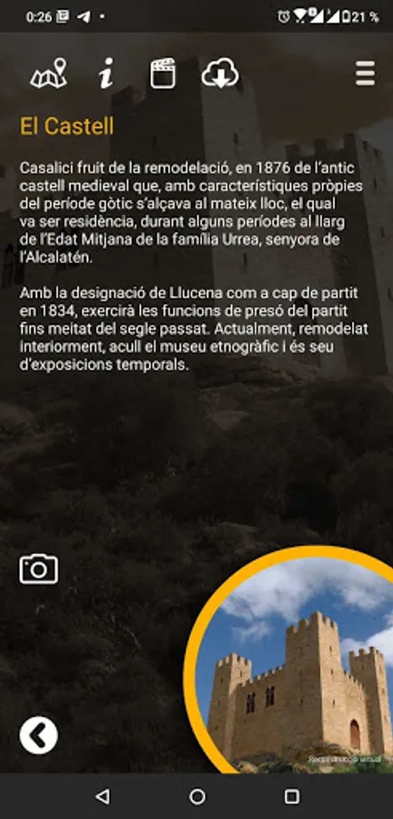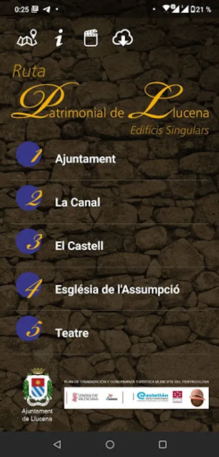 App with tourist information on the Lucena Heritage Route, with information and photographs of La Canal, El Castell, Es Excelencia de l'Assumpció, Teatre, Els perxes, Casa Modernista, El graner, Ermita de Sant Antoni, L'Oró, Ermita San Vicent, Molí de la Vila Muralla i Tamburot.