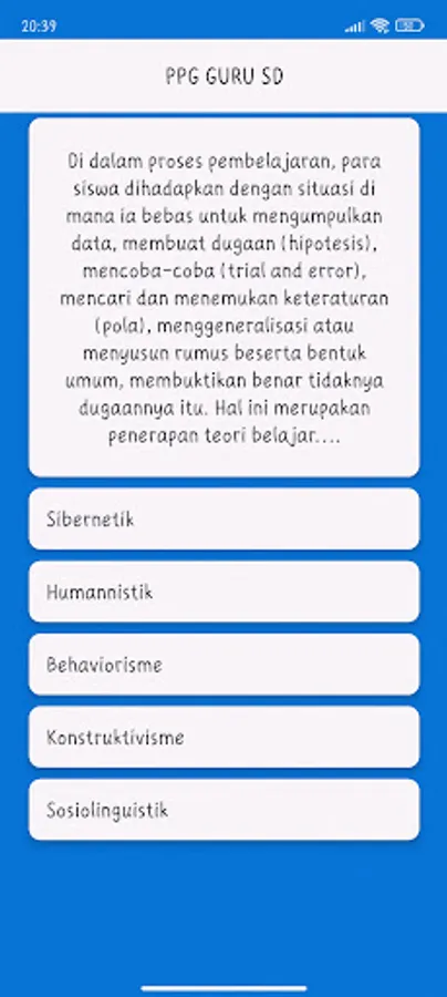The PPG application was developed to train teachers to work on questions to prepare for the PPG Pretest exam for Elementary Teachers so that they can prepare themselves to take the PPG 2023 Pretest exam. The PPGR SD 2023 TEACHER application contains one hundred exam questions in accordance with the Field Report of the PPG 2022 exam so that Elementary Teachers can predict questions who will come out in PPG 2023 exam.