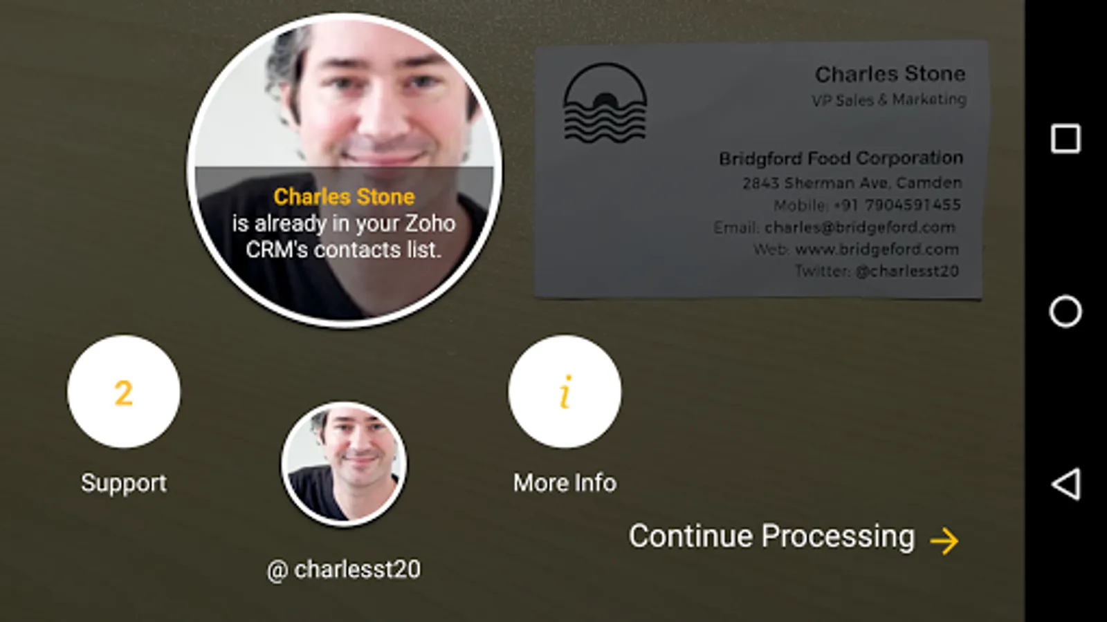Card Scanner is a business card scanning application from Zoho that extracts information from business cards and lets you save the extracted information to Zoho CRM as a Contact or a Lead.