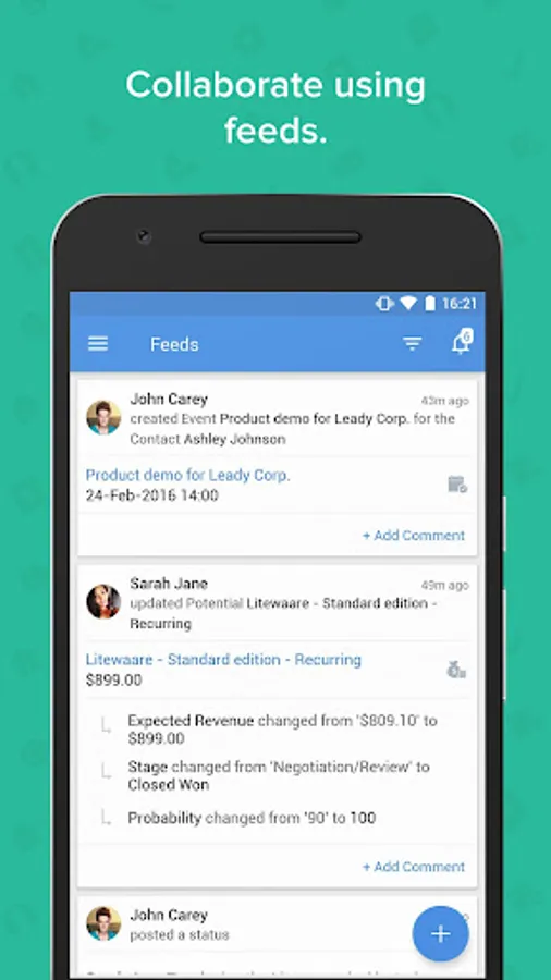 - Collaborate with your team in real-time using Feeds and @mention colleagues on posts.