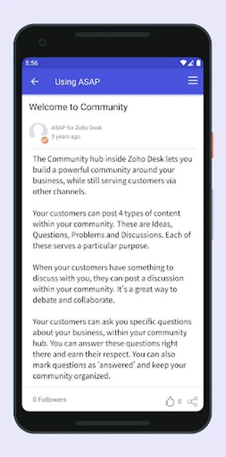 Support EZ is an app created by the Zoho Desk team to give you a taste of how the ASAP SDK can enhance your Android app. Through Support EZ, you can see ASAP in action and get a sense of the different ways and locations in which you can embed Zoho Desk’s help modules (ticketing system, knowledge base, user community, and live chat) within your app.