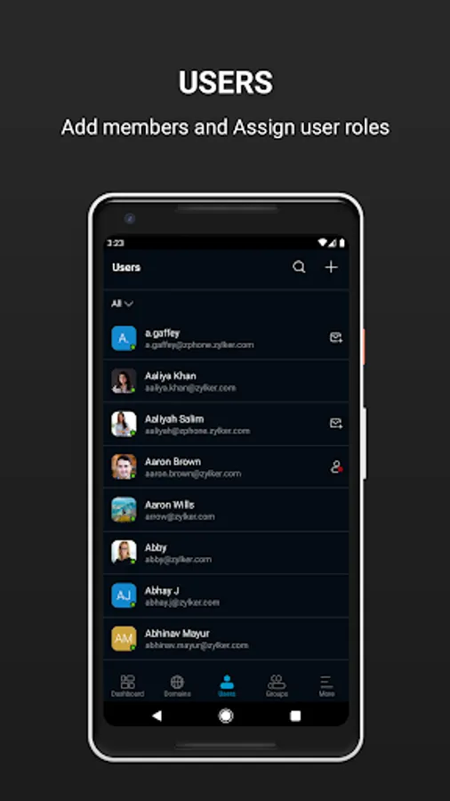 The Zoho Mail Admin App is designed with a complete understanding of System Administrators like you. A classic Black and Red design reminiscent of the powerful system shell lets you manage all your admin tasks in just a few swipes. The App greets you with a lucid dashboard, showcasing upfront the total number of users and groups in your Mail account. Dig deeper, and you get to do all these: